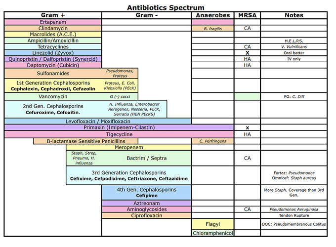 Spectrum of Activity: Staph (not MRSA), Strep, Enterococci, Gram -, anaerobes